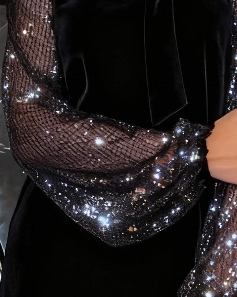 Delicate Sparkling Sleeves – Sheer lantern sleeves with subtle shimmer add a refined festive glow perfect for seasonal gatherings.