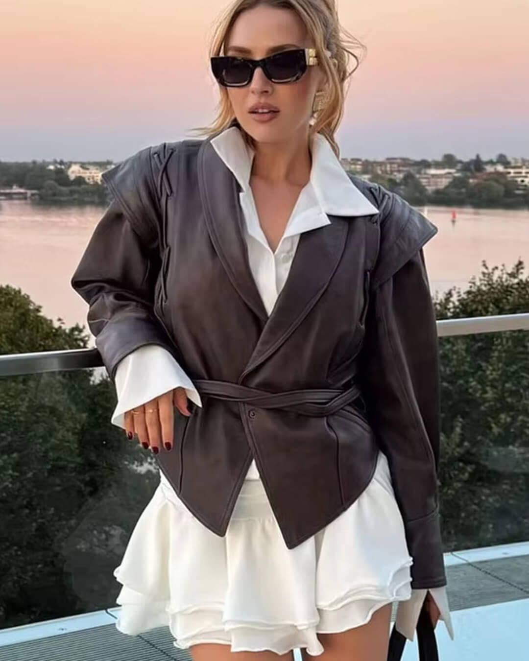 This vintage Zyra Biker Leather Jacket combines classic style with modern comfort. Designed for a regular fit, it features a lapel collar and long sleeves, making it a versatile addition to your wardrobe. This jacket is perfect for layering or wearing on its own.